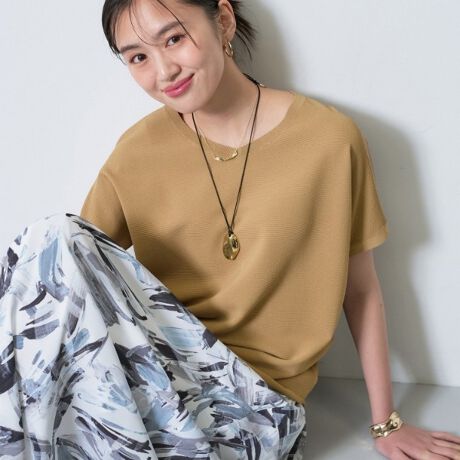 上品な光沢とハリ感のあるストレッチ素材で、ワイドパンツやフレアスカートはもちろん、デニムなどのカジュアルボトムもおすすめです。