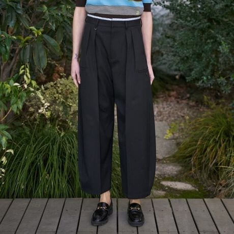 ・今年らしいダブルウエストと、裾にかけて少しテーパードするバレルシルエットで、ベーシックなトップスにも映える1本に仕上げました。