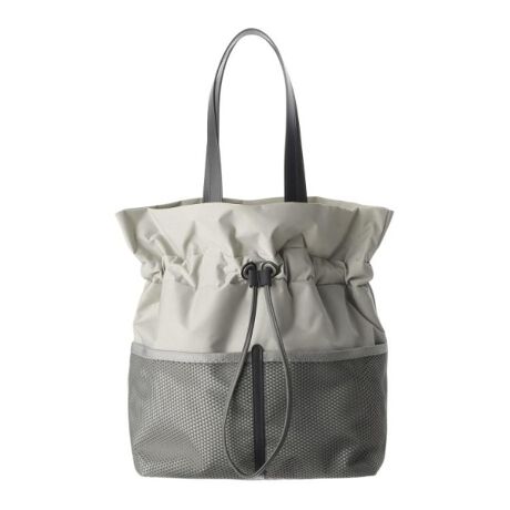 直線的でミニマルなカットにギャザーの丸みがポイントの巾着風トートバッグです。