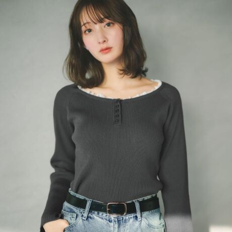レーストリムにヘンリーネックで甘さを抑えたフレアスリーブニット