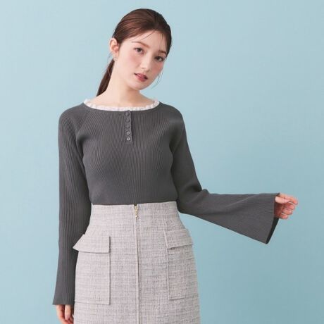 レーストリムにヘンリーネックで甘さを抑えたフレアスリーブニット