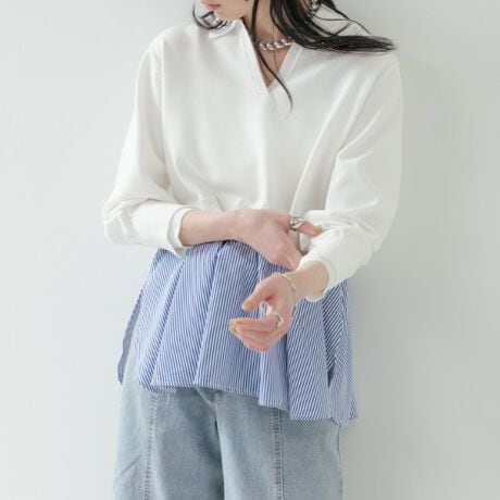 短めの着丈のニットの下からストライプ柄の布帛が覗き、まるで重ね着をしているかのようなデザイン。