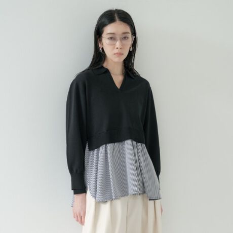 短めの着丈のニットの下からストライプ柄の布帛が覗き、まるで重ね着をしているかのようなデザイン。