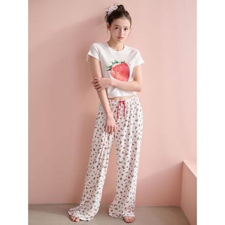<b>柔らかなアイレット生地のいちご柄ロングパンツ</b>