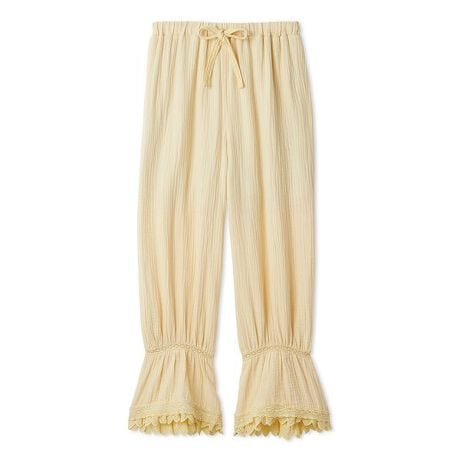 ひざ下にレーステープで絞りを入れた、ボリューミーなシルエットのロングパンツ。