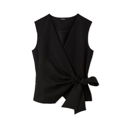 ウエストをぐるりと一周するリボンベルトがポイントのノットデザインペプラムジレです。