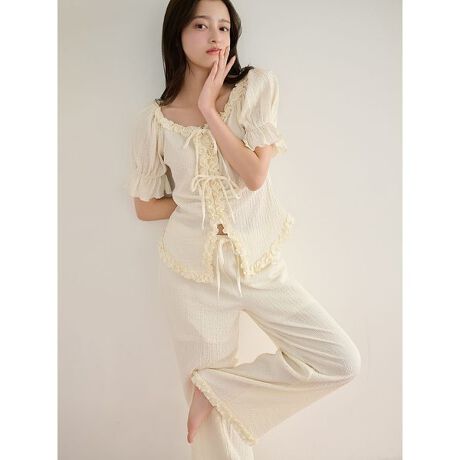 ロングパンツは太めのシルエットで通気性が良く、裾にさりげなく二重フリルをあしらっています。