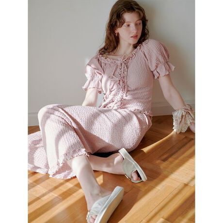 ネックラインから裾にかけて小さなフリルを二重であしらい、ボタンフライのフロントにはリボン結びのアクセントも添えました。