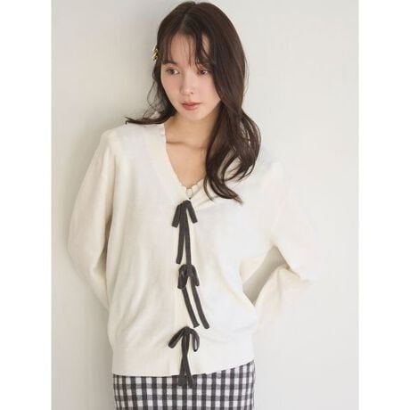 春先に似合うスムースな薄手ニットを使用した、リボンのディテールがキュートなカーディガンです。