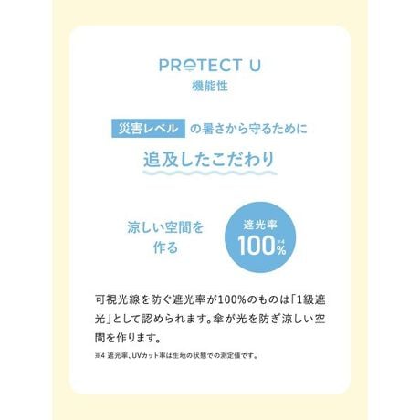 UVカット率100%※4、遮光率100%※4、遮熱率52%以上の高スペックPROTECT Uブランド素材でお作りした晴雨兼用折り畳み傘です。