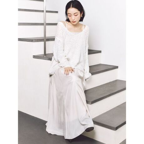 ナチュラルな風合いのスラブニットとシルクライクな生地のキャミソールワンピースとのセットアイテムが到着。春気分を盛り上げる、今季らしいまろやかな色味で展開しています。凸凹とした表面感のスラブ糸を使用したゆったりとしたローゲージニットは、深めのV開きで抜け感をプラス。肩を落としたコケットな着こなしもおすすめ。ロング丈のエレガントなキャミソールワンピースは、程よい光沢感のある軽やかな生地で裾に向かって流れるようなラインを演出。高めのウエスト位置切り替えで美脚効果も抜群です。ショルダーストラップはリボンの長さで調節いただけるデザインです。ワンピースは裏地付き。被りでご着用いただけます。シンプルなデザインで、それぞれ単品でも活躍するアイテムです。