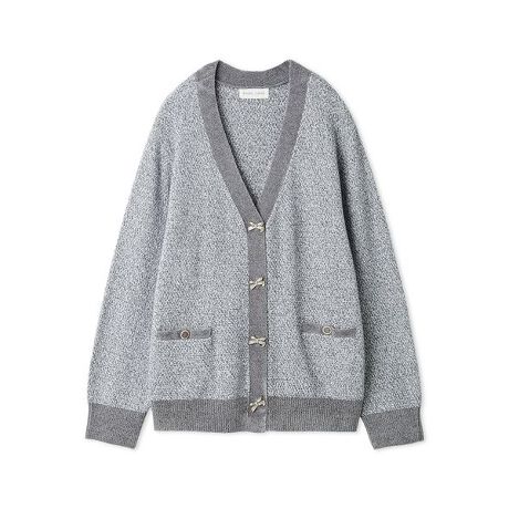 ゆったり着用いただけるVネックカーディガンに、きらめくリボン型のビジューボタンをあしらいました。