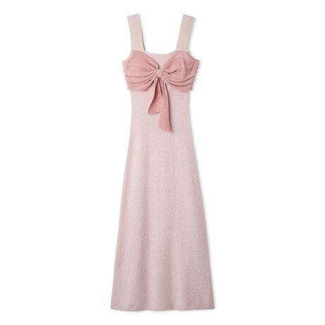 胸元にリボンのデザインを添えた、Iラインシルエットの大人っぽいワンピース。