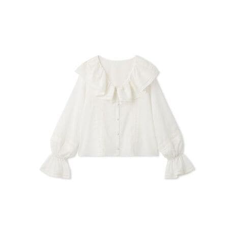 レースの質感にこだわった大人のためのホワイトブラウスシリーズより、顔まわりを華やかに魅せてくれるラッフルカラーのレースブラウスが登場。