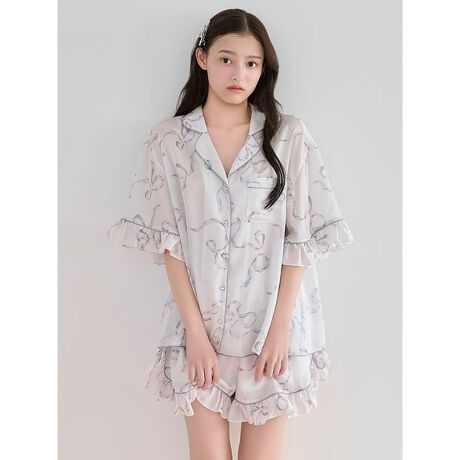 SNIDEL HOME定番のリボン柄を総柄プリントした、するんとした肌触りの「Luxshine」を使用したルームウェアシリーズです。