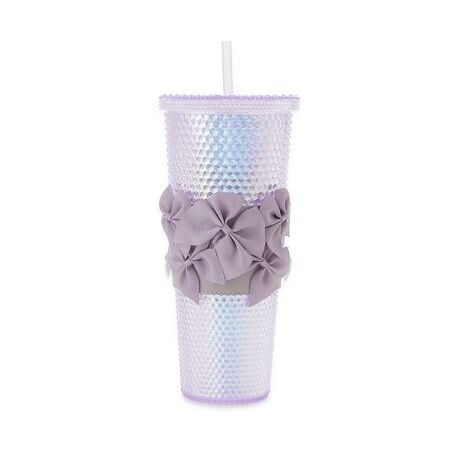 リボン付きの合皮製スリーブがセットになった、キラキラ感が可愛いストロー付きのタンブラーです。