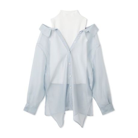 モックネックのノースリーブニットに、セミシアーのオーガンジーシャツを組み合わせた、旬な重ね着を簡単に楽しめる技ありデザイン。