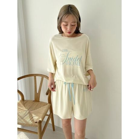 ショートパンツはウエストにさりげなくフリルを付け、左腰にTシャツとお揃いのロゴプリントをあしらいました。