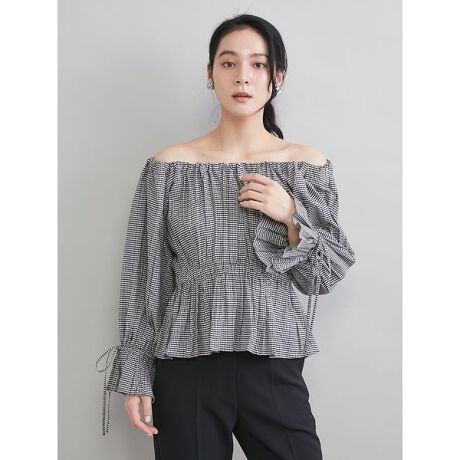 トレンドが続くオフショルブラウス。今季はペプラムシルエットに仕立てて、さらに着こなしの鮮度を高めました。
