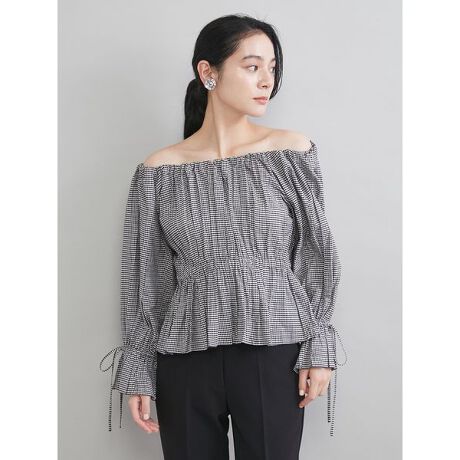 トレンドが続くオフショルブラウス。今季はペプラムシルエットに仕立てて、さらに着こなしの鮮度を高めました。