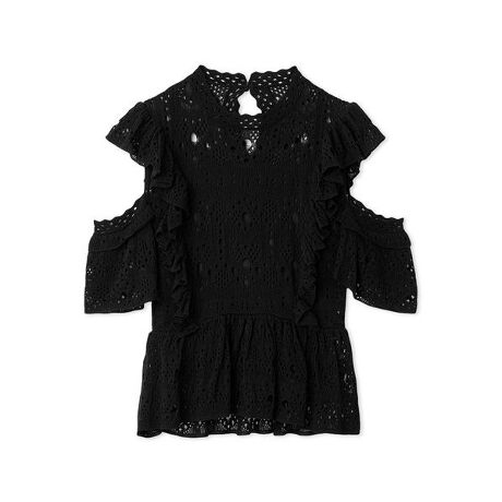 繊細なアイレット編みとペプラムフリルが華やかに映えるニットプルオーバー。