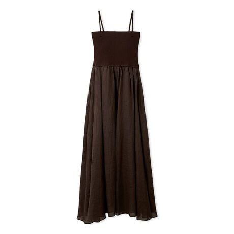 ニットビスチェとリネンスカートをドッキングさせたキャミワンピース。