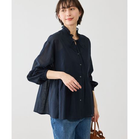 ・きちんと感のあるバンドカラーに、さりげないフリルディテールをプラス。