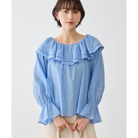 ・レース使いとフリルカラーが目を引く、ボヘミアンシックなムード漂うデザインブラウス。