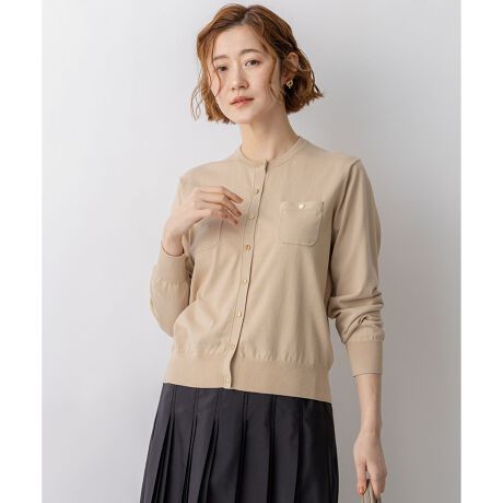 胸元にあしらわれたパッチポケットと、オリジナルのロゴ入りメタルボタンが上品なアクセントになったクルーネックカーディガンです。ベーシックなシルエットながらも、ゴールドカラーのボタンが華やかさをプラスし、一枚着としても羽織りとしても存在感を放ちます。同素材のインナーと合わせてツインセットで着用すれば、クラシカルで洗練されたアンサンブルスタイルに。デニムなどのカジュアルなボトムスと合わせれば、大人の余裕を感じさせるオフスタイルが完成します。オンオフ問わず幅広いシーンで活躍する、ワードローブに加えておきたい一着です。 カラーは、清潔感のあるホワイト(#001)、女性らしい柔らかなピンク(#012)、肌なじみの良い上品なベージュ(#033)、コーディネートのアクセントになる紫がかったブルー(#072)、シックで知的な印象のネイビー(#075)の5色展開です。