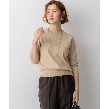 シンプルシックなルックに欠かせない、クルーネックのプルオーバーです。手首がのぞく七分袖のデザインは、全体に抜け感を与えつつ、一枚着としてもバランスよく決まる絶妙な丈感。春先から真夏まで、ロングシーズン着回せる便利なアイテムです。同素材のカーディガンを肩掛けすれば、よりエレガントで洗練されたアンサンブルスタイルが完成します。ボトムスを選ばないシンプルなデザインで、オフィスでのきれいめスタイルから休日のカジュアルダウンまで、幅広いシーンで活躍します。カラーは、清潔感のあるホワイト(#001)、女性らしい柔らかなピンク(#012)、肌なじみの良い上品なベージュ(#033)、コーディネートのアクセントになる紫がかったブルー(#072)、シックで知的な印象のネイビー(#075)の5色展開です。
