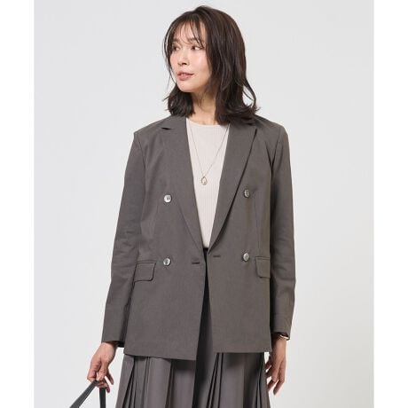 ■デザインクラシカルなムードをまとった、ダブルジャケット。シャープになりすぎないボクシーシルエットで、女性らしさと程よいゆとりを両立しました。ストレッチ性のある素材と裏地無しの軽やかな仕立てで、快適な着心地も魅力です。やや長めの着丈が、ヒップ周りをさりげなくカバー。フロントにはシェル釦をあしらい、春夏らしい清涼感をプラスしました。袖口は釦のないデザインで、折り返してラフに着こなすのもおすすめ。オフィスから普段使いまで、様々なシーンで活躍してくれる、トラッドなベーシックアイテムです。