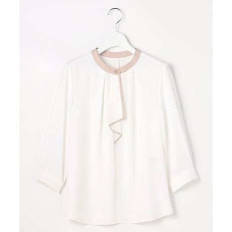 ・ボウタイデザインがポイントのきれいめブラウス・ボウタイ部分のトリミングとバンドカラーの配色がアクセントに・一枚でもジャケットのインナーとしてもおすすめ・シーズンをまたいで活躍する7分丈