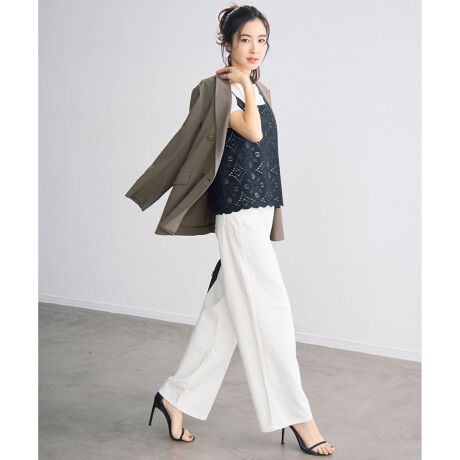 定番スタイルに繊細な彩りをプラスするレースキャミセット■デザイン立体感とエレガンスが漂うレース生地で仕立てたキャミソールとカットソーのセットアイテムです。キャミソールはネックラインをやや浅めのカーブにすることで、すっきりとした印象に仕上げ、大人の女性にも取り入れやすいデザインにしています。レイヤードするだけで、いつものスタイリングにトレンド感と華やかさをプラスしてくれる一着です。■素材キャミソールには、中央アジアのムードから着想を得たオリジナルの大柄レースを使用しています。レーヨンコード糸で縁取ることで立体感を持たせ、エレガンスが漂う表情に仕上げました。複雑な加工を要する複合素材は、完全国内生産にこだわった素材を使用しています。華やかさがありながら、着る人の魅力を引き立ててくれるのもポイントです。インナーにはスムース素材を使用し、天竺に比べて程よい肉感があり、綿ならではのやさしい肌触りです。