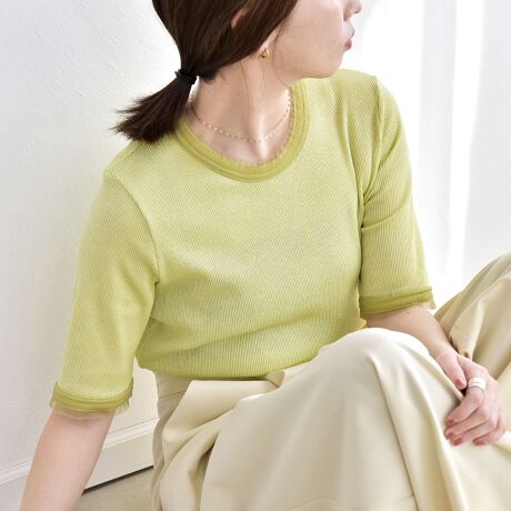 首元と袖口にはさりげなくチュールを施し、カジュアルになりがちなリブTにフェミニン要素をプラス。
