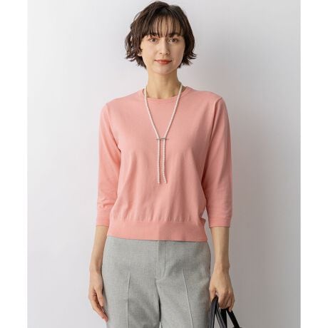 シンプルシックなルックに欠かせない、クルーネックのプルオーバーです。手首がのぞく七分袖のデザインは、全体に抜け感を与えつつ、一枚着としてもバランスよく決まる絶妙な丈感。春先から真夏まで、ロングシーズン着回せる便利なアイテムです。同素材のカーディガンを肩掛けすれば、よりエレガントで洗練されたアンサンブルスタイルが完成します。ボトムスを選ばないシンプルなデザインで、オフィスでのきれいめスタイルから休日のカジュアルダウンまで、幅広いシーンで活躍します。カラーは、清潔感のあるホワイト(#001)、女性らしい柔らかなピンク(#012)、肌なじみの良い上品なベージュ(#033)、コーディネートのアクセントになる紫がかったブルー(#072)、シックで知的な印象のネイビー(#075)の5色展開です。