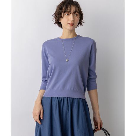 シンプルシックなルックに欠かせない、クルーネックのプルオーバーです。手首がのぞく七分袖のデザインは、全体に抜け感を与えつつ、一枚着としてもバランスよく決まる絶妙な丈感。春先から真夏まで、ロングシーズン着回せる便利なアイテムです。同素材のカーディガンを肩掛けすれば、よりエレガントで洗練されたアンサンブルスタイルが完成します。ボトムスを選ばないシンプルなデザインで、オフィスでのきれいめスタイルから休日のカジュアルダウンまで、幅広いシーンで活躍します。カラーは、清潔感のあるホワイト(#001)、女性らしい柔らかなピンク(#012)、肌なじみの良い上品なベージュ(#033)、コーディネートのアクセントになる紫がかったブルー(#072)、シックで知的な印象のネイビー(#075)の5色展開です。