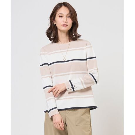 ■デザインミラノリブで編み立てた、ブロッキングボーダーニット。 程よくカジュアルながらも、ミラノリブ特有のきちんとした表情が、大人の女性に似合う1着です。春らしいマリンスタイル漂うブロッキングボーダーは、部分的にラメ糸を使用することで、繊細なきらめきと華やかさをプラスしています。袖口にはJPRESSオリジナルのロゴ釦をあしらい、細部にまでこだわりが光る贅沢なデザインに。心地よい春の光に映える、清涼感たっぷりのアイテムです。 カラーは、優しくフェミニンな印象のローズピンク×グレー(#112)、知的でベーシックなベージュ×ネイビー(#133)、爽やかで清潔感のあるアクア×ネイビー(#172)の3色展開です。