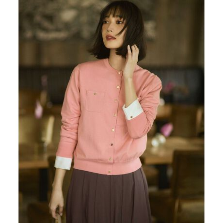胸元にあしらわれたパッチポケットと、オリジナルのロゴ入りメタルボタンが上品なアクセントになったクルーネックカーディガンです。ベーシックなシルエットながらも、ゴールドカラーのボタンが華やかさをプラスし、一枚着としても羽織りとしても存在感を放ちます。同素材のインナーと合わせてツインセットで着用すれば、クラシカルで洗練されたアンサンブルスタイルに。デニムなどのカジュアルなボトムスと合わせれば、大人の余裕を感じさせるオフスタイルが完成します。オンオフ問わず幅広いシーンで活躍する、ワードローブに加えておきたい一着です。 カラーは、清潔感のあるホワイト(#001)、女性らしい柔らかなピンク(#012)、肌なじみの良い上品なベージュ(#033)、コーディネートのアクセントになる紫がかったブルー(#072)、シックで知的な印象のネイビー(#075)の5色展開です。