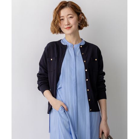 胸元にあしらわれたパッチポケットと、オリジナルのロゴ入りメタルボタンが上品なアクセントになったクルーネックカーディガンです。ベーシックなシルエットながらも、ゴールドカラーのボタンが華やかさをプラスし、一枚着としても羽織りとしても存在感を放ちます。同素材のインナーと合わせてツインセットで着用すれば、クラシカルで洗練されたアンサンブルスタイルに。デニムなどのカジュアルなボトムスと合わせれば、大人の余裕を感じさせるオフスタイルが完成します。オンオフ問わず幅広いシーンで活躍する、ワードローブに加えておきたい一着です。 カラーは、清潔感のあるホワイト(#001)、女性らしい柔らかなピンク(#012)、肌なじみの良い上品なベージュ(#033)、コーディネートのアクセントになる紫がかったブルー(#072)、シックで知的な印象のネイビー(#075)の5色展開です。