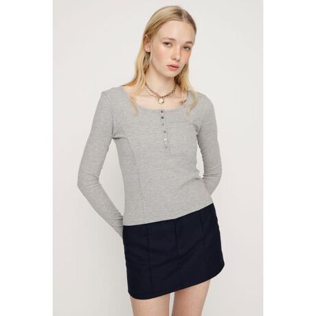 【HENRY NECK CUT TOPS】■POINTさりげなく輝くラメ入りのリブ素材と、前立てに施したシェルボタンがポイントのトップス。トレンドのヘンリーネックで程よく開いたネックラインがデコルテまわりをすっきりと見せてくれます。シンプルながらもラメ素材が表情をプラスし、抜け感のある1枚に仕上げています。■DETAIL程よくフィットするリブ素材が身体のラインを綺麗に見せてくれるので、上半身の華奢見えを叶えます。シェルボタンもさりげないポイントで、女性らしさをプラスしました。ボタンは上側だけ少し開けて着用して頂くとスタイリングに抜け感がでます。デイリーに使用できるブラック、杢グレーに加えて、スタイリングのポイントになるライトパープルの3色展開です。■STYLINGシンプルなアイテムなのでデニムからスカートまで幅広いボトムスと相性抜群です。ジャケットなどのアウターのインナー使いとしても活躍するのでロングシーズンでご使用頂けます。■FABRIC/MATERIAL伸縮性のあるラメ入りリブカット素材を使用。■透け感:なし■光沢感:あり■伸縮性:あり■裏 地:なし※お取り扱い上のご注意・スリット・ラメ糸、の素材特性上、以下の点にご注意下さい。・汗や皮脂、汚れが付着したまま放置されますと光沢の消失につながります。・スリット・ラメ糸は糸が引き出されやすいため、他の物との摩擦にご注意下さい。・高温多湿での保管はお避け下さい。変色する事があります。・お肌のデリケートな方は刺激を感じる場合があります。刺激を感じた際は、すぐにご使用をお避け下さい。※釦について・天然貝の釦を使用しているため色合いや厚みに多少の固体差があります。・また割れ易い素材のため下記の点にご注意下さい。・擦れたり、ぶつかったりして割れることがあるのでご着用時に強い衝撃が加わらないようご注意下さい。・洗濯やクリーニングの際は、釦を布等で包むなどして保護することにより衝撃を軽減することが可能です。・脱水は釦に負荷がかからないように手で絞るか、脱水機をご使用の際は短時間処理して下さい。・アイロンやプレスの際は釦を避けて行って下さい。[注意事項]※画像の商品はサンプルです。実際の商品と仕様、加工が若干異なる場合があります。※画像の商品は光の照射や角度、お使いのモニター環境により、実物と色