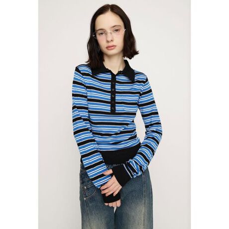 【HG KNIT POLO TOPS】■POINT斜めにデザインされた前立てが、SLYらしい遊び心溢れるポロ襟ニットトップス。ウエストまわりがスッキリと見えるジャスト丈がボトムスを選ばないアイテムです。ベーシックながら、スタイリングの主役になる1枚です。■DETAIL落ち感のあるハイゲージ天竺ニットを使用し、カジュアルすぎない上品な印象を与えるアイテムです。ポロ襟デザインで開けて着用すればコーディネートに抜け感をプラスします。SLYオリジナルで作成した配色ボーダーが主役になるマルチブルーと無地グレーの2色展開です。■STYLINGデニムなどカジュアルなアイテムとのスタイリングはもちろん、ミニボトムスとロングブーツでガーリーなスタイリングもおすすめです。■FABRIC/MATERIAL伸縮性のある天竺ニットを使用しています。■透け感:なし■光沢感:なし■伸縮性:なし■裏 地:なし[注意事項]※画像の商品はサンプルです。実際の商品と仕様、加工が若干異なる場合があります。※画像の商品は光の照射や角度、お使いのモニター環境により、実物と色味が異なる場合がございます。※着用、お取り扱いの際は、アテンションタグをご確認ください。※一部予約商品につきましては生産上の都合によりお届け予定日や店頭発売と前後する場合もございます。※追加生産商品は、一部の店舗、通販で販売中の場合がございます。予めご了承下さい。