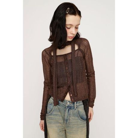 【TIE RIBBON KNIT TOPS】■POINTクラシカルなムードと抜け感を兼ね備えたタイデザインのシアーニットトップス。程よく透け感のある素材は落ち感があり、女性らしいムードを演出してくれます。首元のタイはスカーフのように首に巻いたスタイリングが一押しです。■DETAIL程よくタイトなシルエットと、広めに開いた首元は顔まわりをすっきり魅せてくれます。程良く透け感のある表面感のある素材がポイントで、伸縮性のある素材なのでストレスフリーな着心地です。ベーシックなブラックと程よいラメ感のあるブラウン、スタイリングのポイントになるレッドの3色展開です。■STYLINGフロントのボタンは下4個以外は飾りボタンなので安心して着用していただけ、スタイリングによっては裾のボタンを開けて肌見せを楽しむのもおすすめです。スカートなど女性らしいスタイリングはもちろん、あえてカジュアルなボトムスと合わせると抜け感のあるスタイリングが完成します。■FABRIC/MATERIAL伸縮性の良いポリエステルニットを使用。■透け感:あり■光沢感:色によってあり■伸縮性:なし■裏地:なし※お取り扱い上のご注意・本品は素材の特性上色落ちします。・洗濯、クリーニング、着用(使用)時に他の衣類や雑貨、家具類に色移りする事があります。・特に汗や雨等で湿った状態では、色落ちが顕著になります。・白、淡色との組み合わせは避け、お取り扱いには十分ご注意下さい。[注意事項]※画像の商品はサンプルです。実際の商品と仕様、加工が若干異なる場合があります。※画像の商品は光の照射や角度、お使いのモニター環境により、実物と色味が異なる場合がございます。※着用、お取り扱いの際は、アテンションタグをご確認ください。※一部予約商品につきましては生産上の都合によりお届け予定日や店頭発売と前後する場合もございます。※追加生産商品は、一部の店舗、通販で販売中の場合がございます。予めご了承下さい。