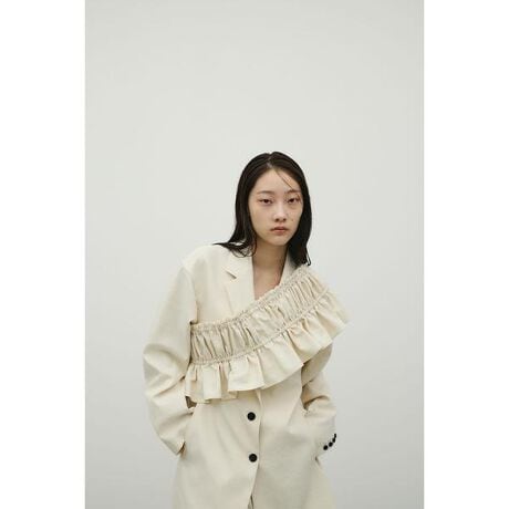 モデル身長163cm(FREEサイズ着用)【STYLEMIXER high-line collection】日本の北陸産地で作成した糸を使用し、ドライタッチで程よい張りのある特殊な糸を使用しています。高圧気流染めによって生地に膨らみを出し、ヴィンテージ感を表現した自然な凹凸感が、高級感あるシルエットを表現します。しわになりにくく、モードなクオリティでありながらイージーケアができ、シーズンレスに対応できるのが特徴です。スタイリングのアクセントになるフリルビスチェが登場。ギャザーをたっぷりと寄せた立体感のあるデザインで、コーディネートに動きと華やかさをプラス。キャミソールとしての着用はもちろん、ジャケットの上から斜めにレイヤードしたり、腰に巻いたりして、アレンジ次第で幅広い着こなしが楽しめるマルチウェイ仕様。肩紐はアジャスターで長さ調整可能。フロントの共紐もフィット感をお好みに合わせて調整可能です。500JSA30-0571(ハイラインテーラードジャケット)、500JSA31-0591(ハイラインワイドパンツ)とセットアップ着用可能。ストレッチややあり、透け感なし。【お手入れ方法】手洗い可