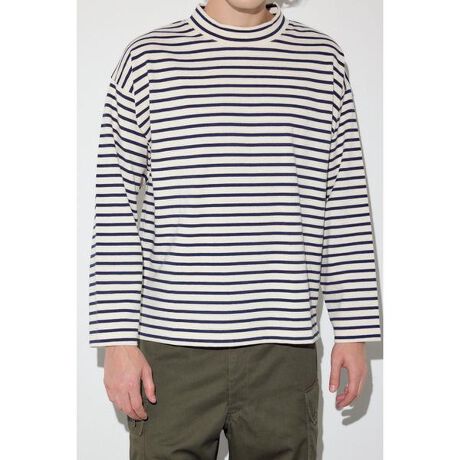 ■ボーダー長袖トップス■ポイントモックネックデザインが特徴の、長袖ボーダートップス。■ディテール首元をすっきり見せるモックネックと程よいボーダー幅で、カジュアルながら上品な印象に。柄WHT、柄GRY、柄BLKの3色展開で、コーディネートに合わせやすい定番配色です。綿100%の三子糸を使用した肉厚でしっかりした生地感です。三本撚りの糸ならではの立体感と高い耐久性を備え、やや度甘に編み立てることで、程よい柔らかさも兼ね備えています。縫製は耐久性を重視し、袖口や裾まできれいに仕上げています。■スタイリング単品でデニムやチノパンツに合わせたカジュアルスタイルに最適。ジャケットやコートのインナーとしても存在感があり、レイヤードで首元を見せるとバランス良く決まります。柄WHTは爽やかに、柄BLKはモノトーンで引き締め、柄GRYは落ち着いた大人カジュアルにおすすめです。■生地やや太めの3本の糸を撚り合わせた「三子糸(みこいと)」で編み立てた生地を使用。一般的なTシャツ生地のイメージを覆す、タフさと上品さを兼ね備えた素材感が特徴です。肉厚でしっかりとしながらも、少し度甘に仕上げています。透け感:なし裏 地:なし伸縮性:なし光沢感:なし[注意事項]※画像の商品はサンプルです。実際の商品と仕様、加工が若干異なる場合があります。※画像の商品は光の照射や角度、お使いのモニター環境により、実物と色味が異なる場合がございます。※着用、お取り扱いの際は、アテンションタグをご確認ください。