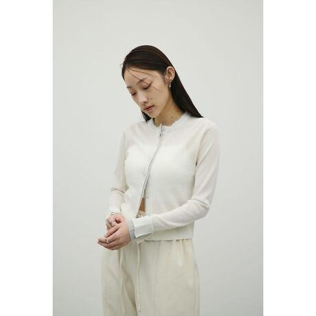 モデル身長163cm(FREEサイズ着用)衿、前立て、袖口をバイカラーで仕立てた、配色デザインがポイントのニットカーデ。シンプルな中にさりげないコントラストを効かせたコーディネートのアクセントとして活躍する一枚です。程よくシャリ感のある糸を使用し、天竺組織で軽く編み立てているため、さらっとした肌触りで快適な着心地を叶えます。カーディガンの中にロンTなどをレイヤードしやすいシルエットに仕上げており、ジャケットやアウターの中にコーディネートしても着膨れせず着用していただけます。透け感あり、ストレッチあり。【お手入れ方法】ドライクリーニング