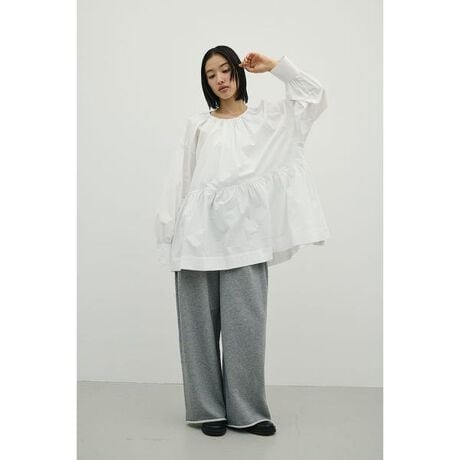 モデル身長166cm(FREEサイズ着用)動いた時のフレアシルエットが美しくエアリー感のあるギャザーをたっぷりと寄せたコットンシャツ。前立ては共地リボン開き仕様になっており、前後2WAYで着用可能。衿ぐりの共地リボンは調整可能なため、お好みのネックの開き具合で着用いただけます。袖口はカフス仕様なので、たくしあげてパフっと着用するのがおすすめです。ハリのあるコットンを使用。透け感WHTややあり、ストレッチなし。【お手入れ方法】マシンウォッシュ可