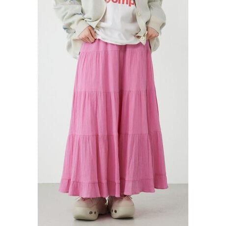■ポイントAラインに広がるシルエットで、歩くたびに揺れ動くティアードスカートです。腰まわりが膨らんで見えない様ボリューム調整をし、裾にはたっぷりと広がるシルエットパターン。ウエストはゴム仕様なのでストレスフリーで着用できます。■ディテールベーシックなブラック、オフホワイトはどんなスタイルにも合わせられる万能カラー。グリーン、ライトピンクの鮮やかなカラーは着用するだけで気分が上がります。カラーに拘ったRODEO CROWNSオリジナルティアードスカートをお楽しみください。■スタイリングカジュアルなグラフィックデザインTシャツ合わせがおすすめです。ラフさもありながら、甘さを抑えくれ今っぽい空気感を表現できます。■生地表地には楊柳生地を使用。柔らかく軽い着心地で、凹凸のある表面感が肌への密着を抑え、通気性が良く蒸れにくい素材です。■透け感:なし■裏 地:あり■伸縮性:なし■光沢感:なし[注意事項]※画像の商品はサンプルです。実際の商品と仕様、加工が若干異なる場合があります。※画像の商品は光の照射や角度、お使いのモニター環境により、実物と色味が異なる場合がございます。※着用、お取り扱いの際は、アテンションタグをご確認ください。