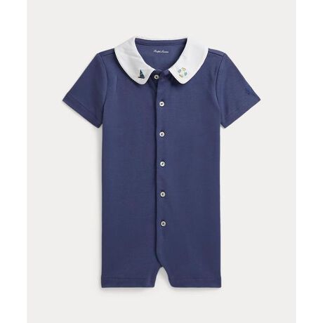 とても柔らかいコットンインターロックを使用し、襟にノーティカル風の刺繍をあしらった可愛らしいワンピース。・パイピングトリムを施したブロードクロスのピーターパンカラー / 左の襟先に救命ブイの刺繍 / 右の襟先にセールボートの刺繍・ボタン付き前立て・半袖 / 左袖にRLの文字の刺繍・裾に隠しリングスナップ 【素材】・本体:綿 100% 装飾部分を除く【生産国】インドネシア