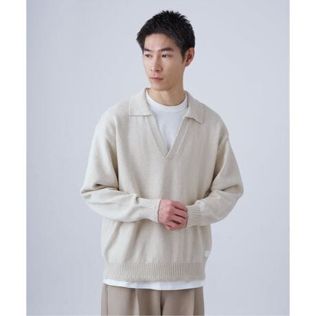 胸元の深めVネックが程よい開放感を生み、Tシャツを覗かせるだけでレイヤードがきれいに決まります。