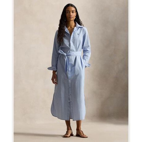 コットンを使用して長めのシルエットにデザインし、ウエストを強調するセルフベルトでアクセントをプラスしたストライプ柄のシャツドレス。サイドシームポケットと、ラウンド型にカーブしたクラシックな裾が特徴・ストレートのシルエット / くるぶしよりやや上の着丈・ポインテッドカラー / ボタン付き前立て / シェルボタン・長袖、ボタン付きバレルカフス / サイドシームポケット・ボックスプリーツのバックヨーク / ラウンド型にカーブした裾 / 裏地なし / セルフベルト付き・左胸にシグネチャーのポニー刺繍・モデル身長178cm、着用サイズ4※注意:柄の配置は、商品によって異なります。 【素材】・本体:綿 100% 装飾部分を除く【生産国】ベトナム